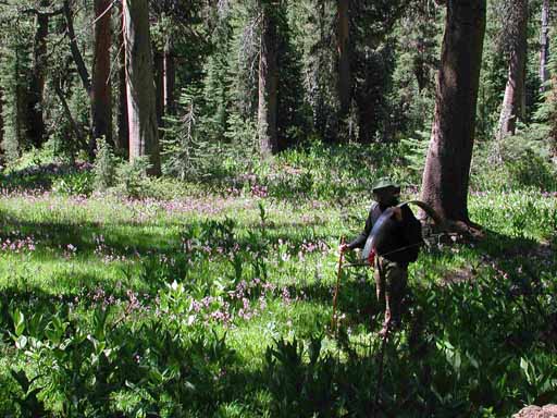 Bill carrying the saw across an alpine meadow.