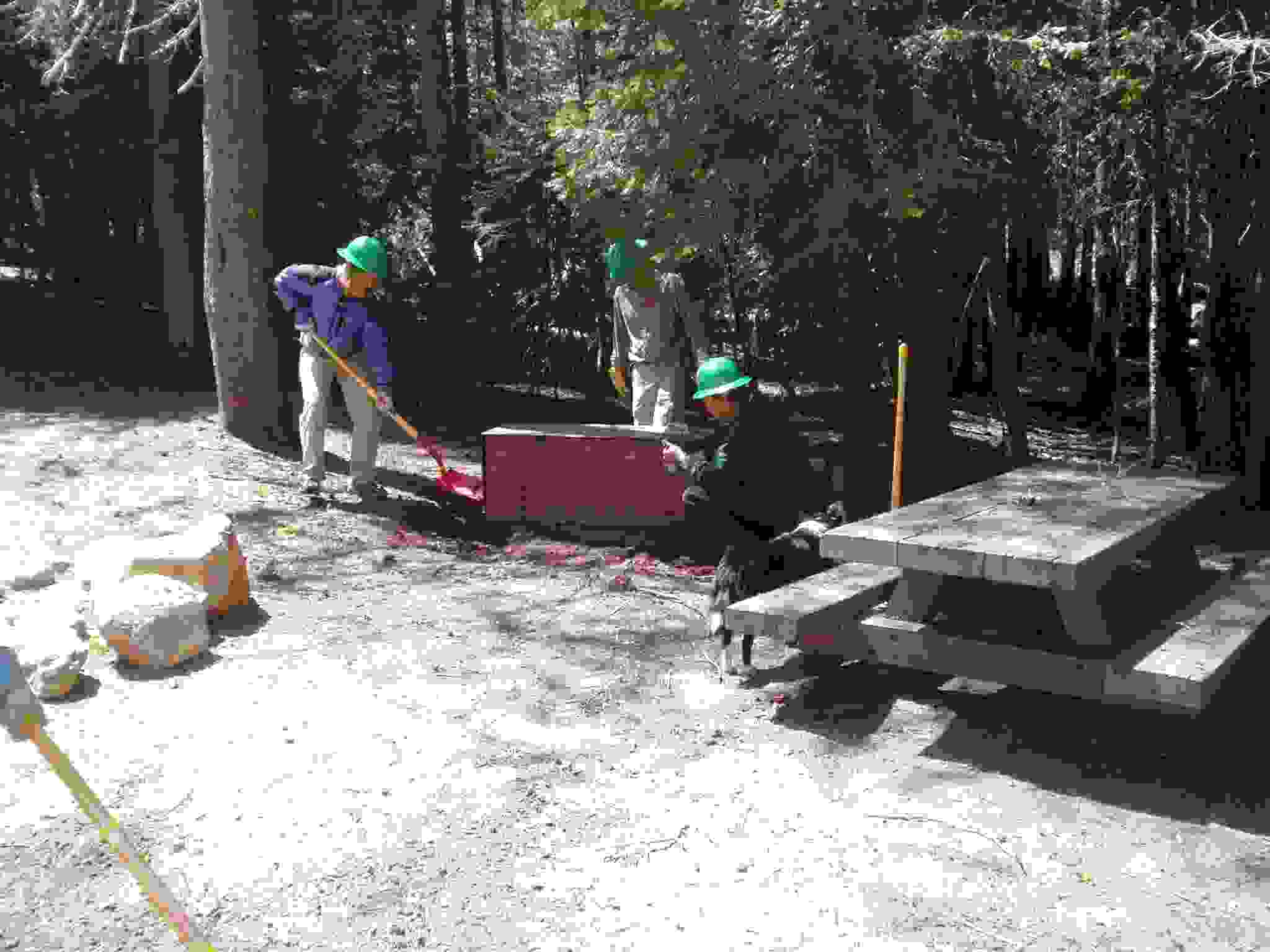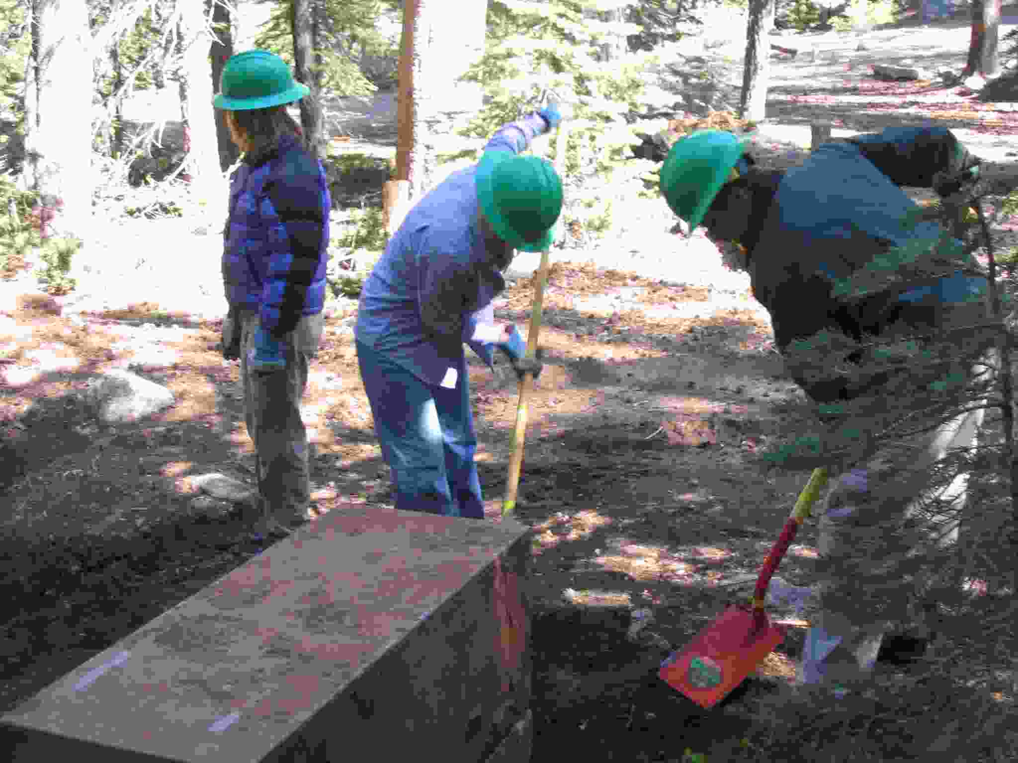 Keith shoveling dirt underneath a bear box while ? and Lisa hold it up.