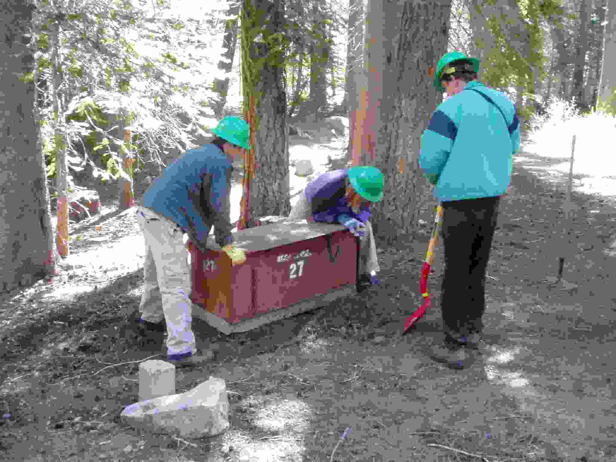 Team placing and leveling a bear box.