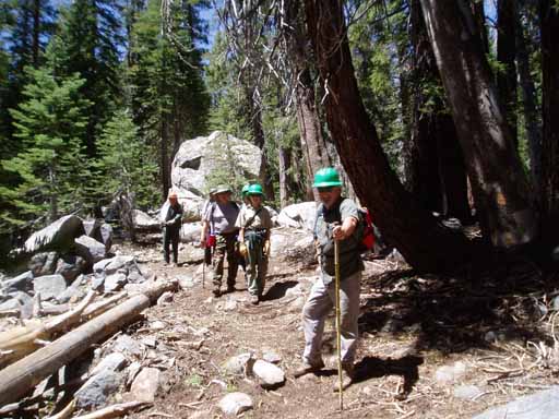 Ted, Bill, Pedro (with a hand sledge, or single jack, which is used to break off dead tree branches) and Eric debranching a downed tree near the trail.