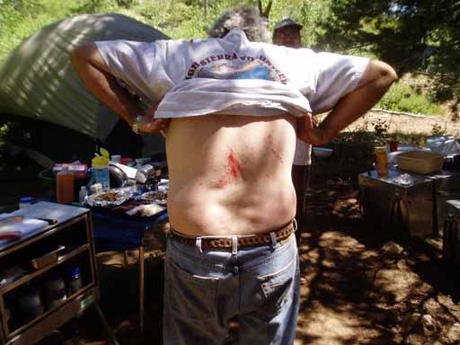 Norm's back with Skip. We didn't have a mirror in camp so I took this picture so that Norm could see what happened to his back when he fell while fishing.