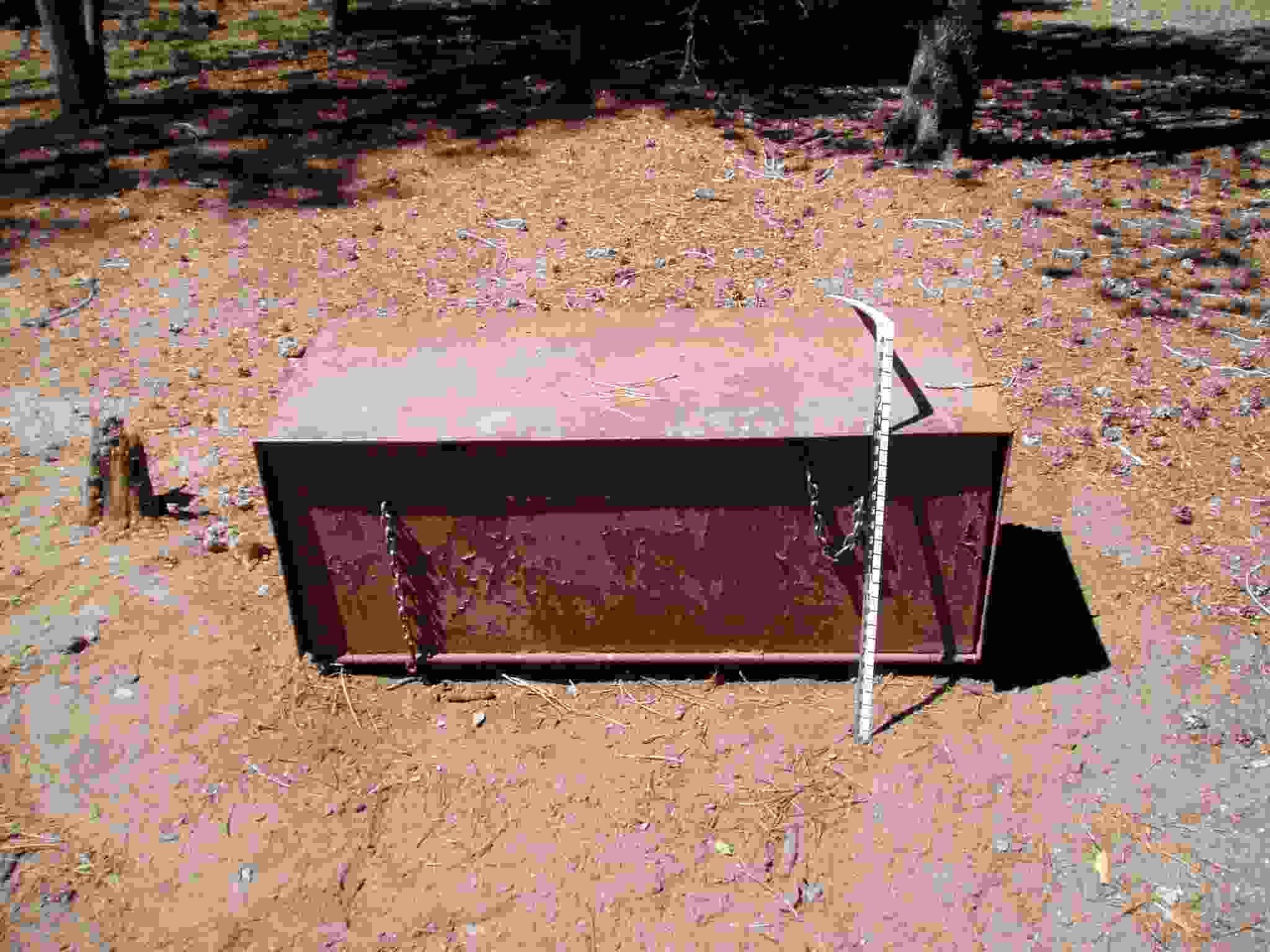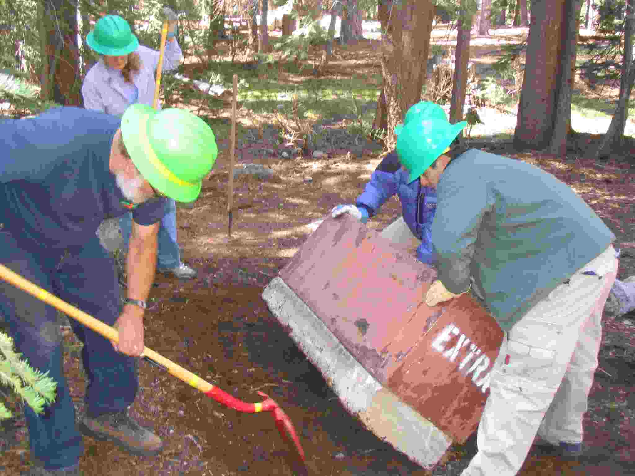 Keith shoveling dirt underneath a bear box while ? and Lisa hold it up.