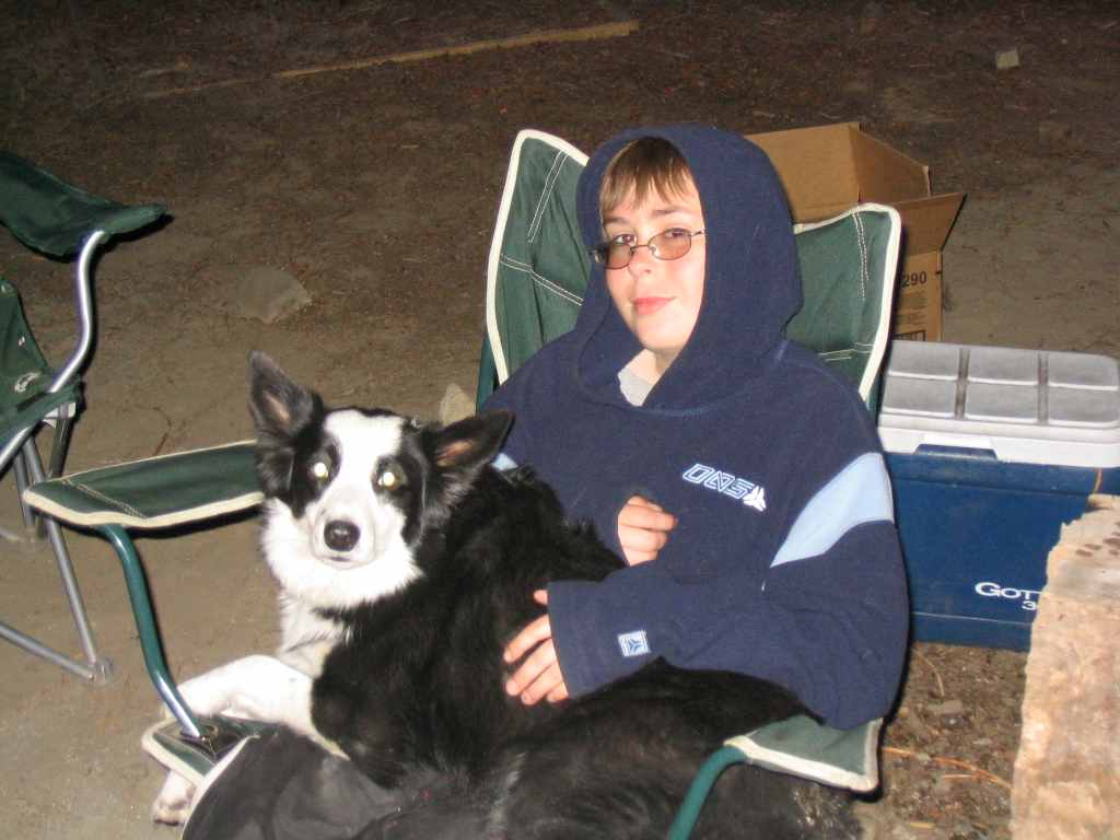 Em, Tom and new dog around fire after dinner.