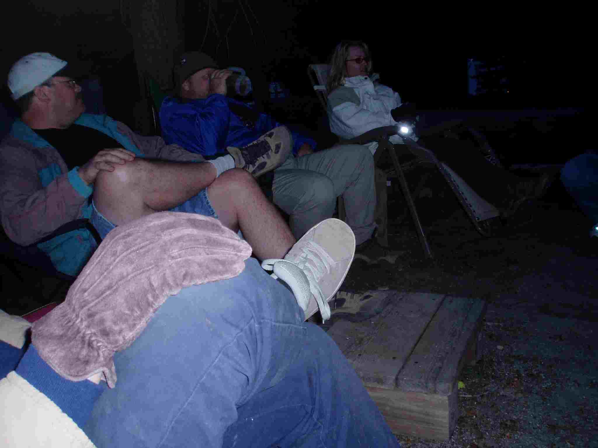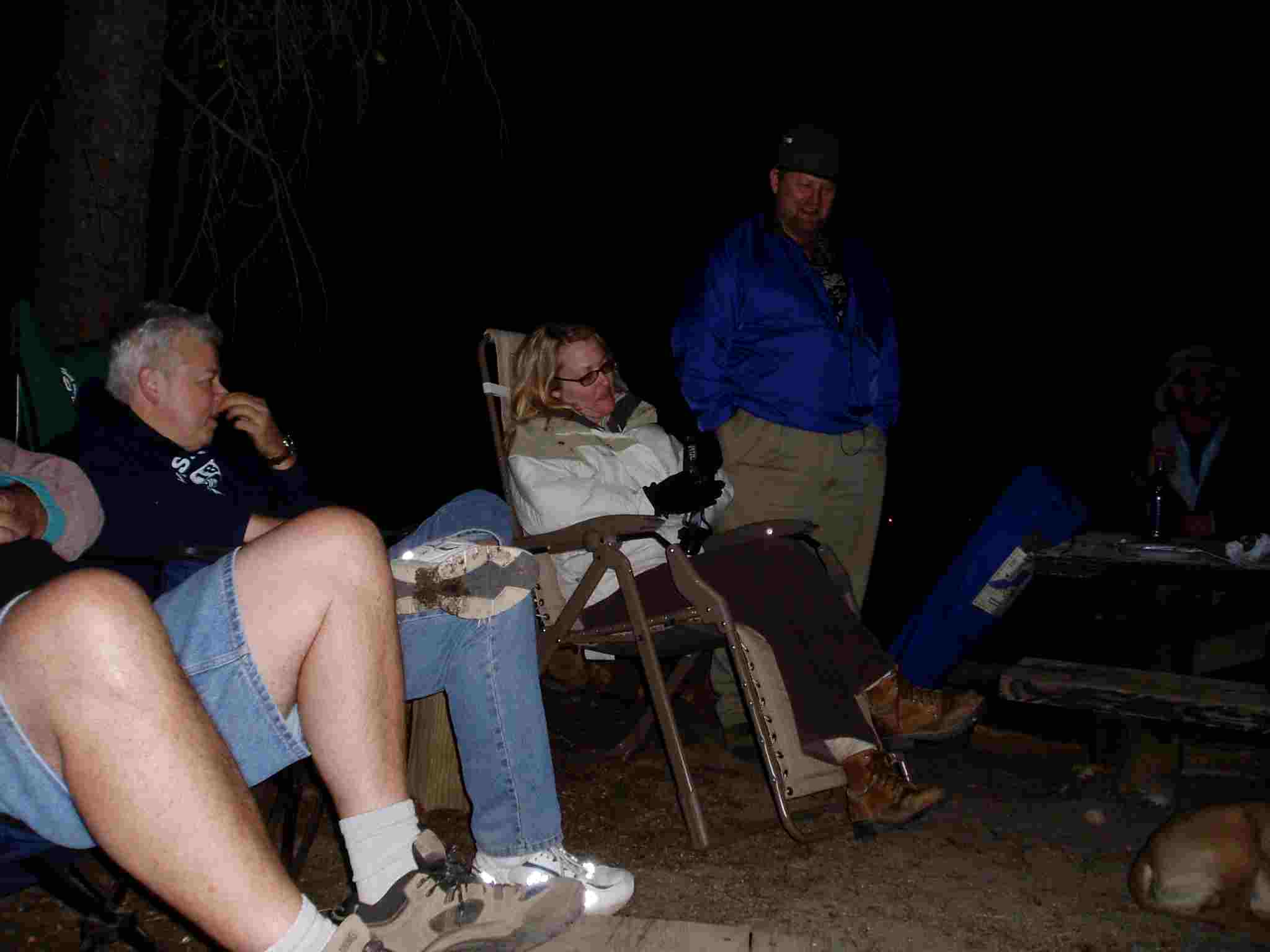 Sherri (in mega-chair), Phil, Tom, Barbara around the fire the first night.