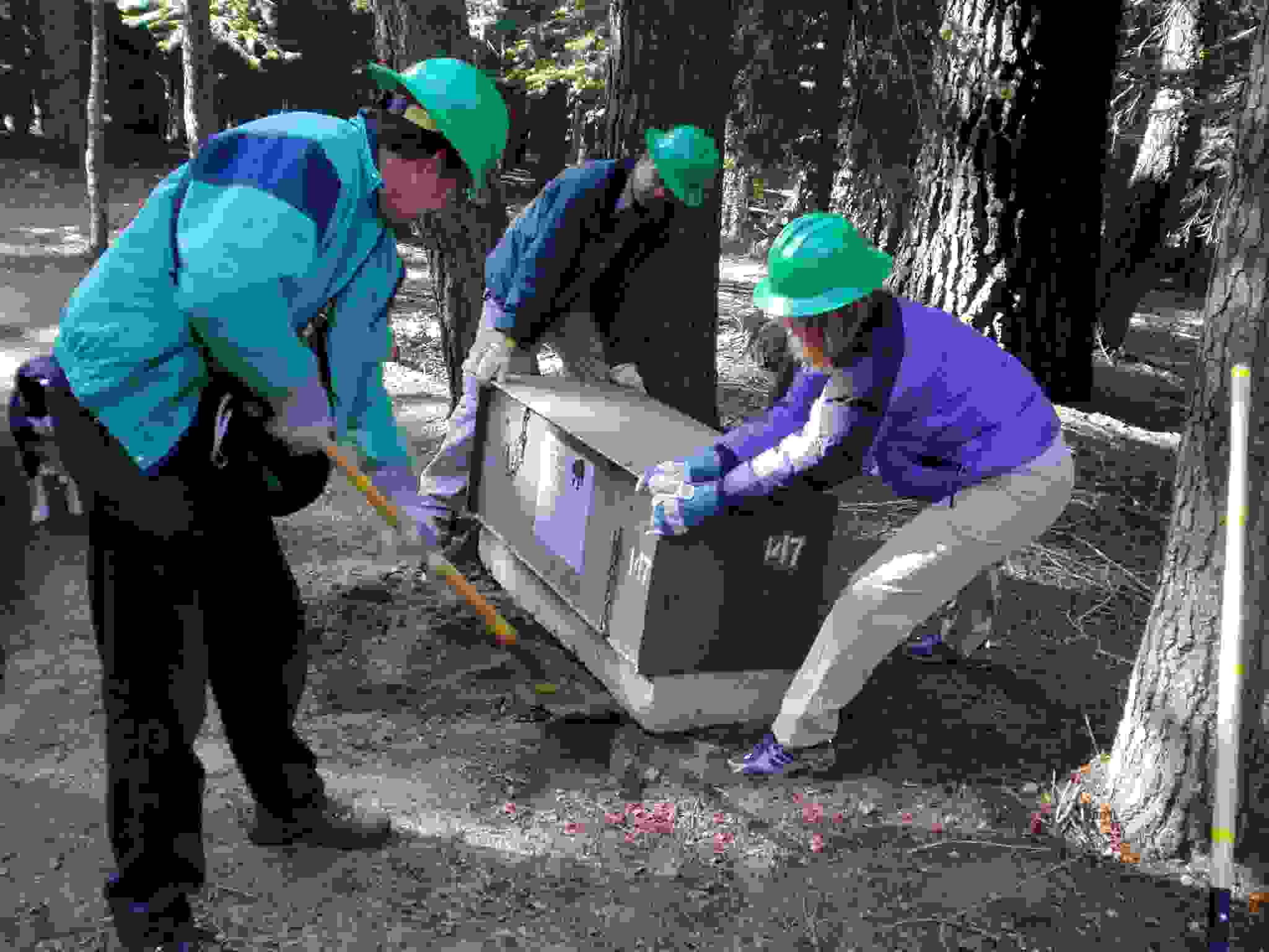 Team placing and leveling a bear box.